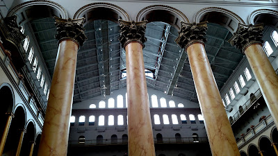 The carpeting in the grand atrium of the National Building Museum features a symmetric pattern.
