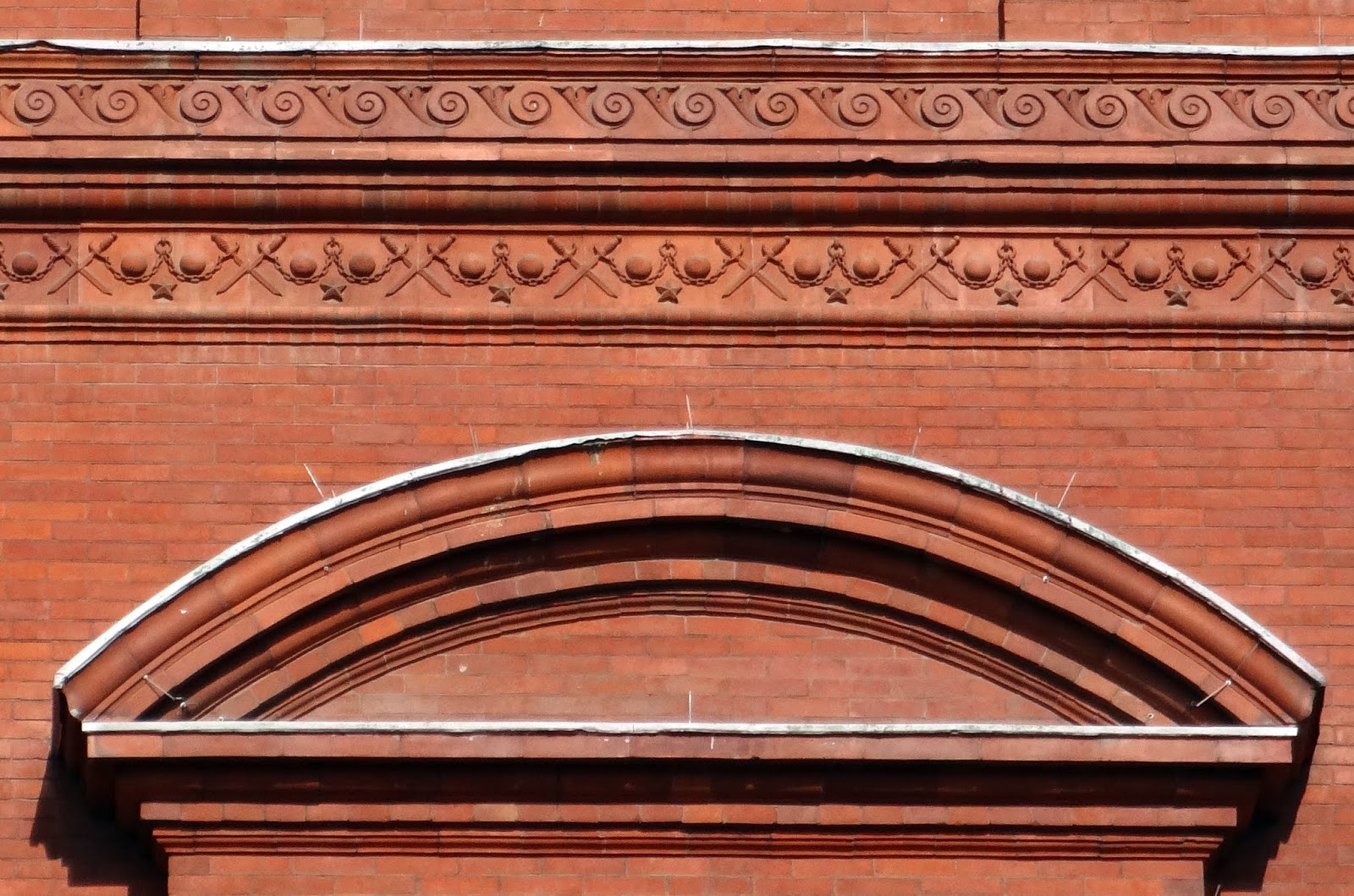 Frieze patterns with repeated designs decorate many of the building's exterior walls.